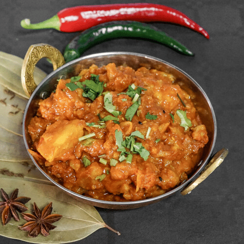 Zartes Lammfleisch, saftige Zwiebeln, reife Tomaten, aromatischer Ingwer und würziger Knoblauch, harmonisch abgerundet mit frisch gemahlenen Gewürzen zu einem köstlichen Gericht gekocht.
